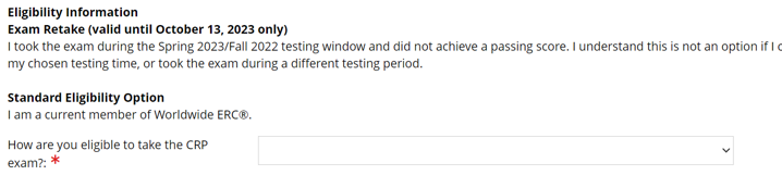 If you took the CRP Examination during the current calendar year and did not achieve a passing score, you are eligible to retake the exam at reduced rate during the next testing window for a $215 application fee. This rate is only valid through April 14. You are not eligible for this rate if you took the exam in previous calendar years, cancelled, or failed to show up for your exam time.