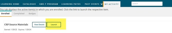 The source materials are located under the My Activity -> Enrolled tab. Some materials can be downloaded, and some are only available in digital format accessible through the Portal. Select ‘Launch’ when you are ready to view.