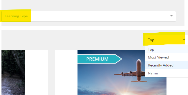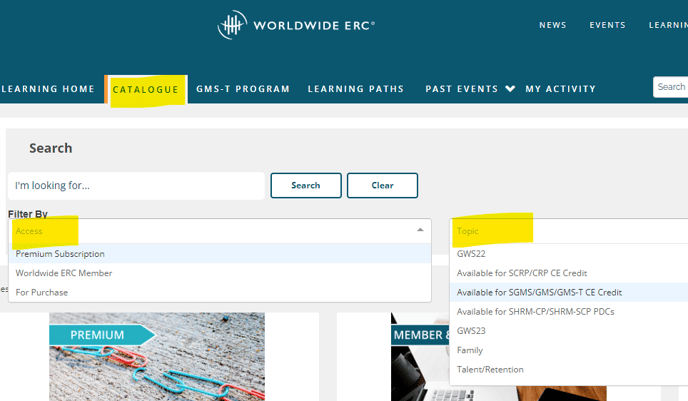 Available webinars are located under the "Catalogue" tab. You have the option to filter by access, topic, and learning type. You will also see to the far right, you can filter by top, recently added, most viewed, and name.