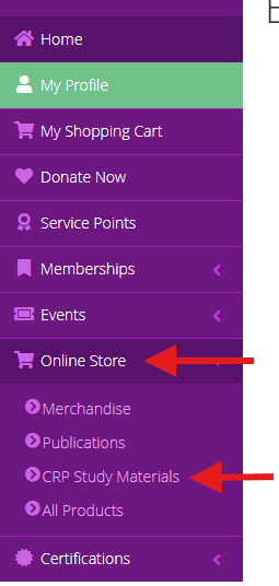 2. In the left navigation menu, click "Online Store," then click "CRP Study Materials"