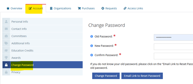 2. Click the "Account" tab towards the top of the screen, then "Change Password" from the left navigation menu.